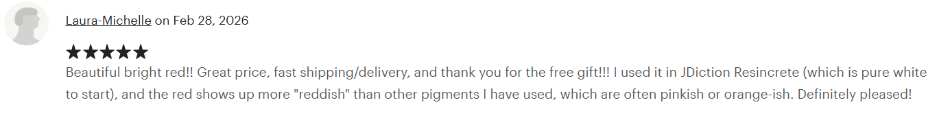 Shop Pigments2/28/26 | Beautiful bright red!! Great price, fast shipping/delivery, and thank you for the free gift!!! I used it in JDiction Resincrete (which is pure white to start), and the red shows up more "reddish" than other pigments I have used, which are often pinkish or orange-ish. Definitely pleased!