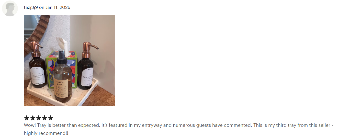 Shop Accent Trays1/11/26 | Wow! Tray is better than expected. It’s featured in my entryway and numerous guests have commented. This is my third tray from this seller - highly recommend!!