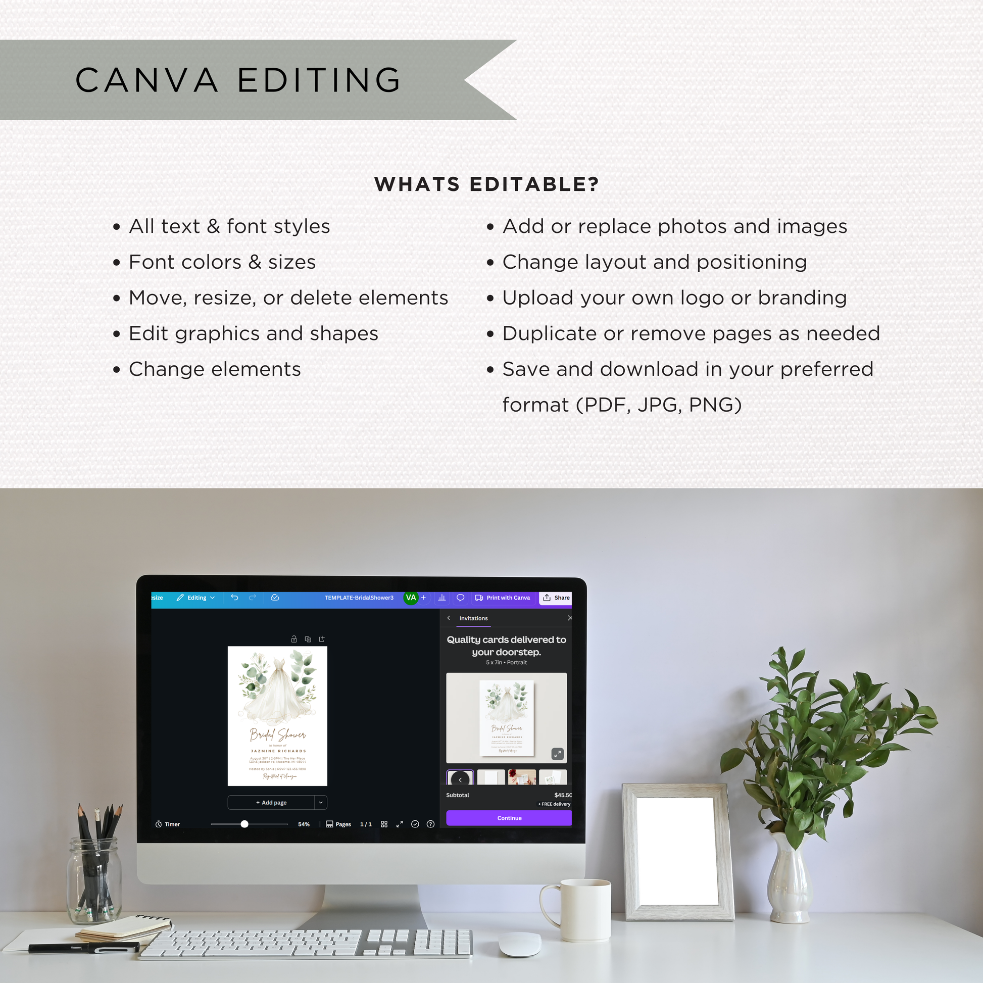 This editable Canva bridal shower invitation is designed for effortless customization. Easily personalize the bride’s name, event date, time, location, host details, and RSVP information in just minutes—no design experience required. Ideal for printing or sharing digitally via text or email.