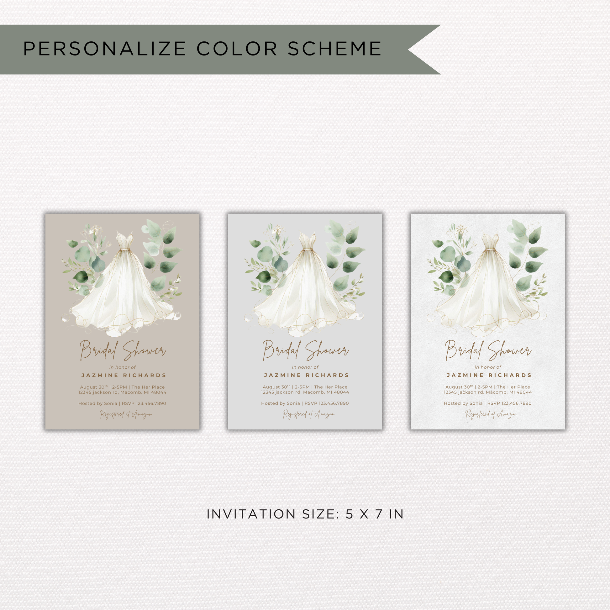 Celebrate the bride-to-be with this romantic bridal shower invitation template, featuring a delicate hand-drawn wedding dress illustration, soft greenery accents, and a clean, timeless layout. The neutral color palette and flowing lines create an elegant, airy feel—perfect for a classic, boho, or garden-inspired bridal shower.