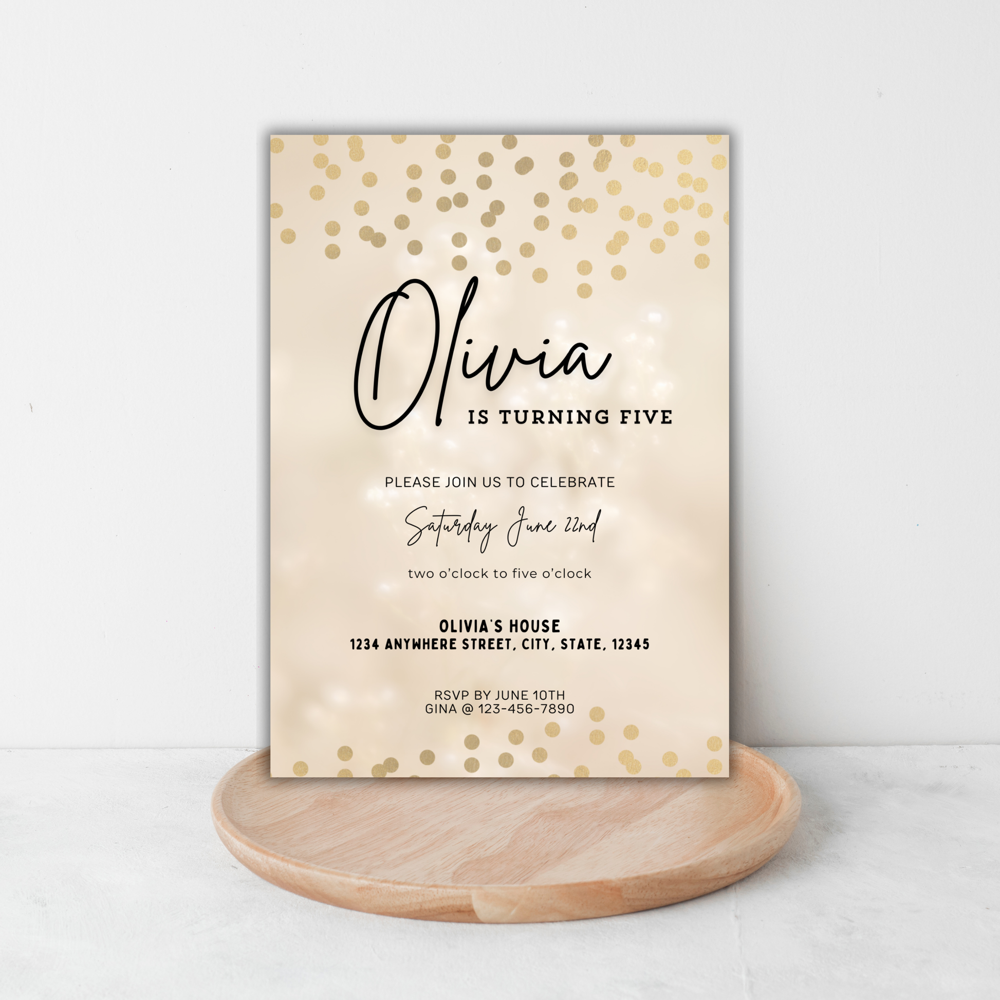 Make birthdays extra special with this elegant and timeless birthday invitation template. Featuring a soft neutral background, scattered gold confetti accents, and modern script typography, this editable Canva invite is perfect for stylish, classic, or minimalist kids’ birthday celebrations. Easily customize the name, age, party details, and RSVP — no design experience needed!