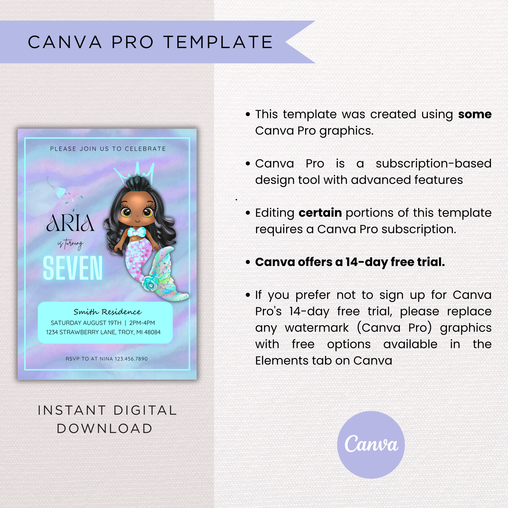 Celebrate your little one’s special day with this vibrant mermaid birthday invitation! Featuring a playful, curly-haired mermaid surrounded by magical under-the-sea colors in bright blues, purples, and teals, this template is perfect for a fun and enchanting celebration. The shimmering details and bold lettering add a touch of sparkle and excitement, making it the perfect invite for an unforgettable mermaid-themed party!