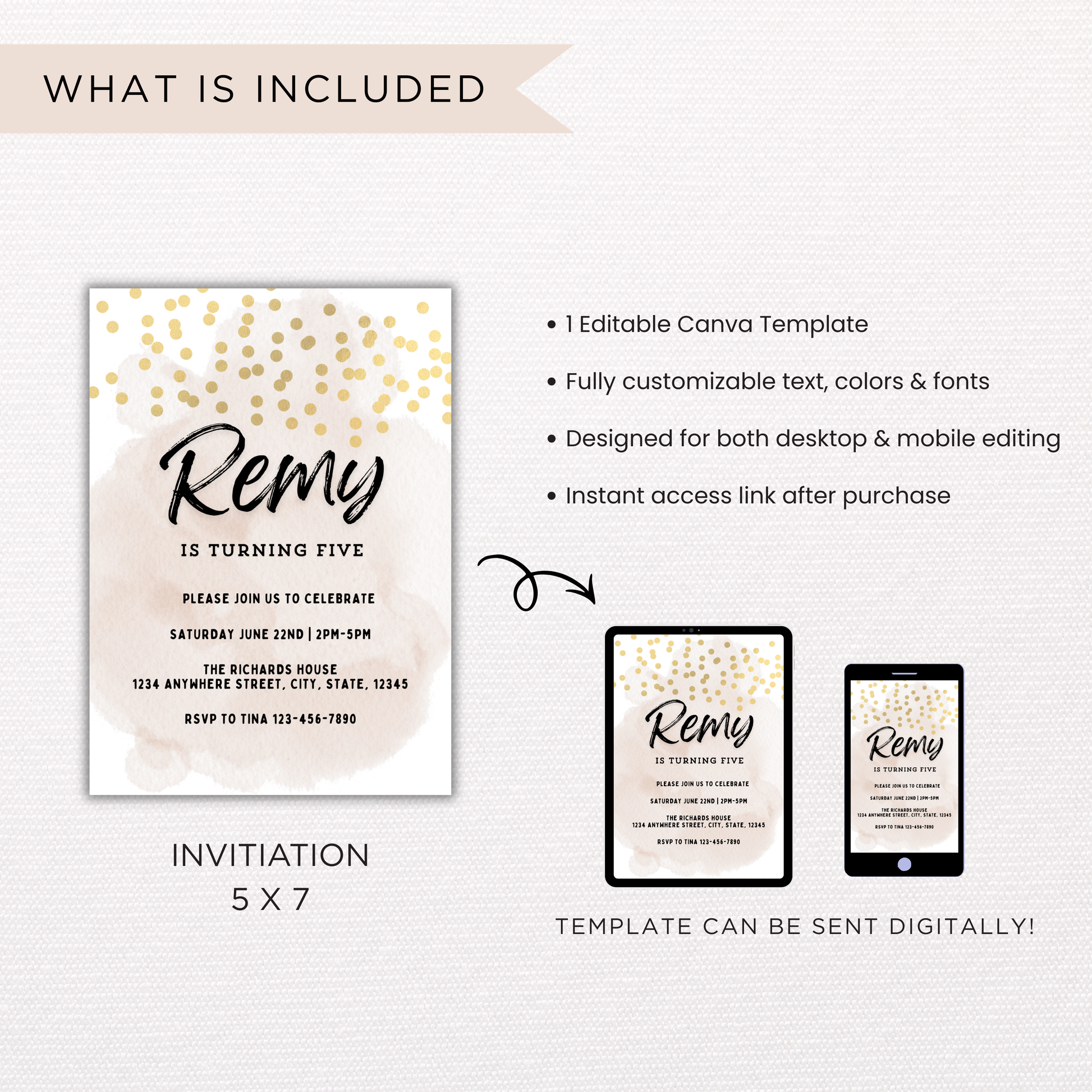 Celebrate your child’s special day with this modern watercolor birthday invitation template. Featuring a soft neutral background, subtle watercolor textures, and elegant gold confetti accents, this timeless design is perfect for stylish and minimal birthday celebrations.