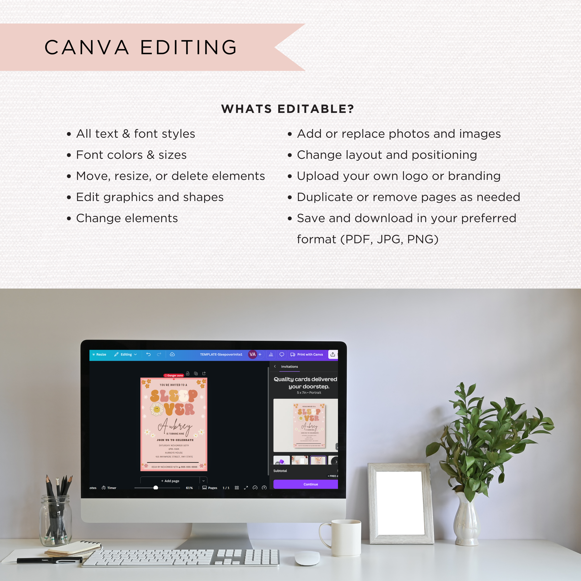 Sleepover Birthday Invitation for Girls | Editable Canva Template | Digital Download | Instant Printable Invite