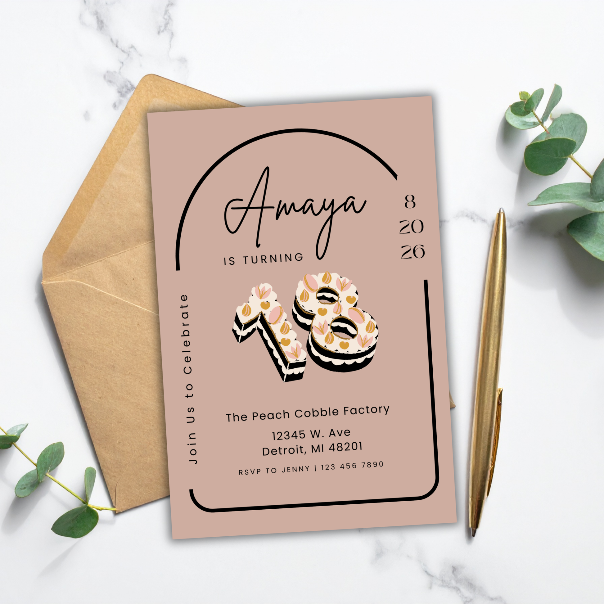 Celebrate an 18th birthday in style with this modern number birthday invitation template. Featuring a soft neutral background, a playful cake-style “18” design, and elegant floral accents, this editable Canva invite is perfect for chic, fun, and memorable 18th birthday celebrations.