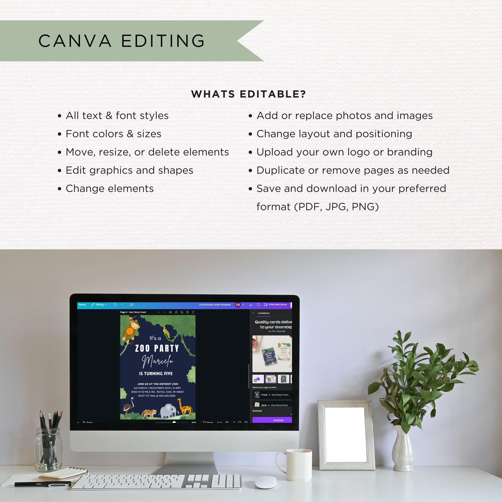 Celebrate your little one with this Zoo Birthday Invitation Template. Featuring charming illustrated animals and a playful nature-inspired design, this editable Canva invite is perfect for animal-loving kids and zoo-themed birthday parties.