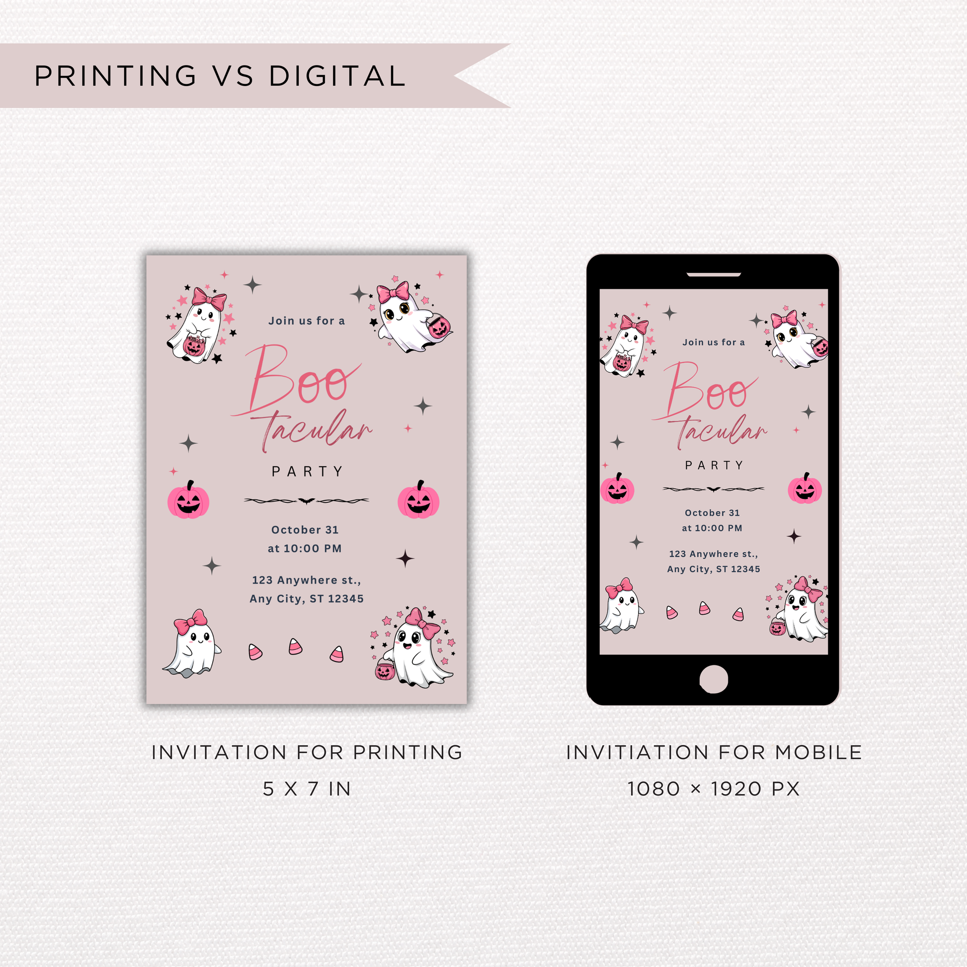 Celebrate a spooky-cute Halloween party with this Boo-tacular birthday invitation template. Featuring adorable ghost illustrations, playful pink accents, and a soft blush background, this editable Canva invite is perfect for fun, festive, and kid-friendly Halloween celebrations.