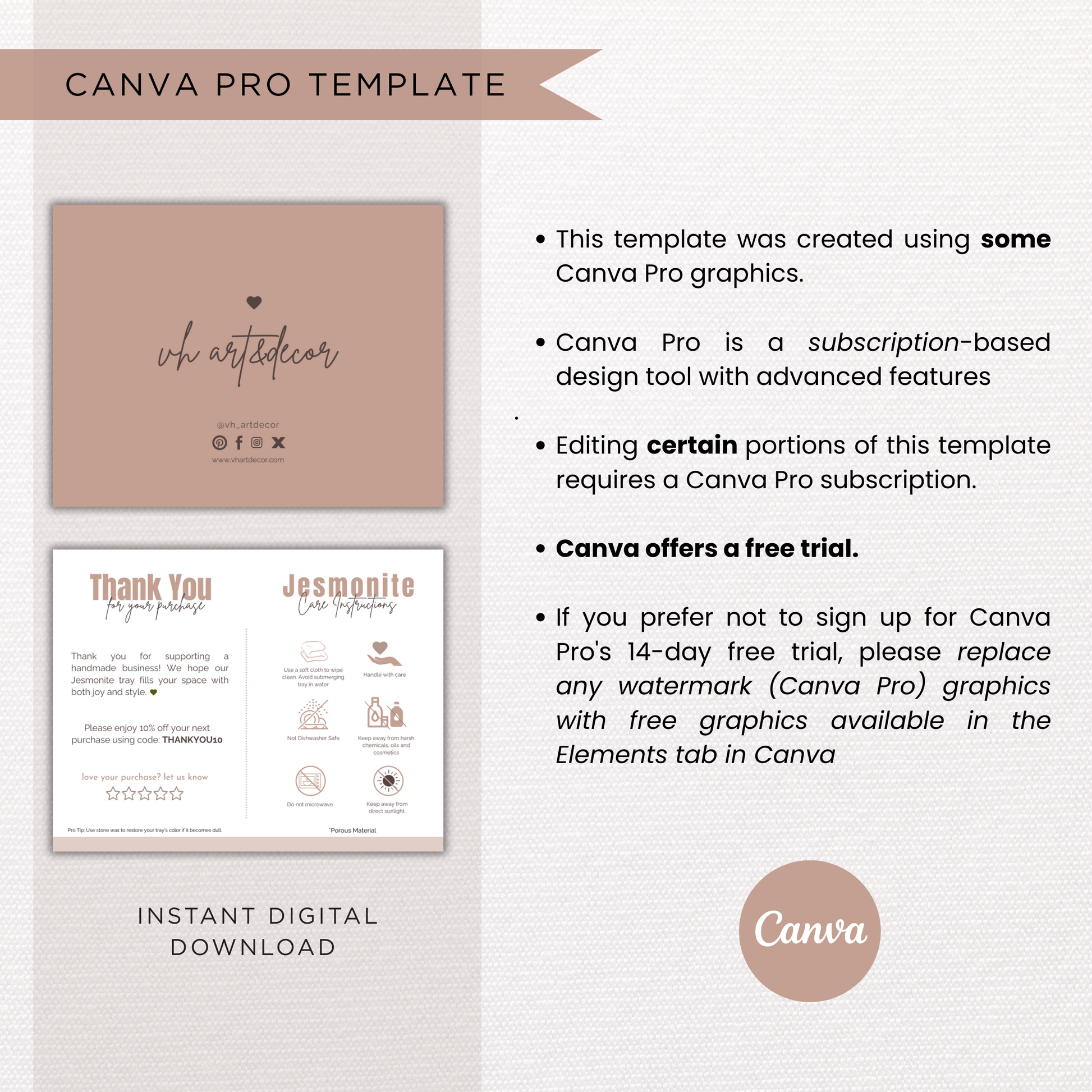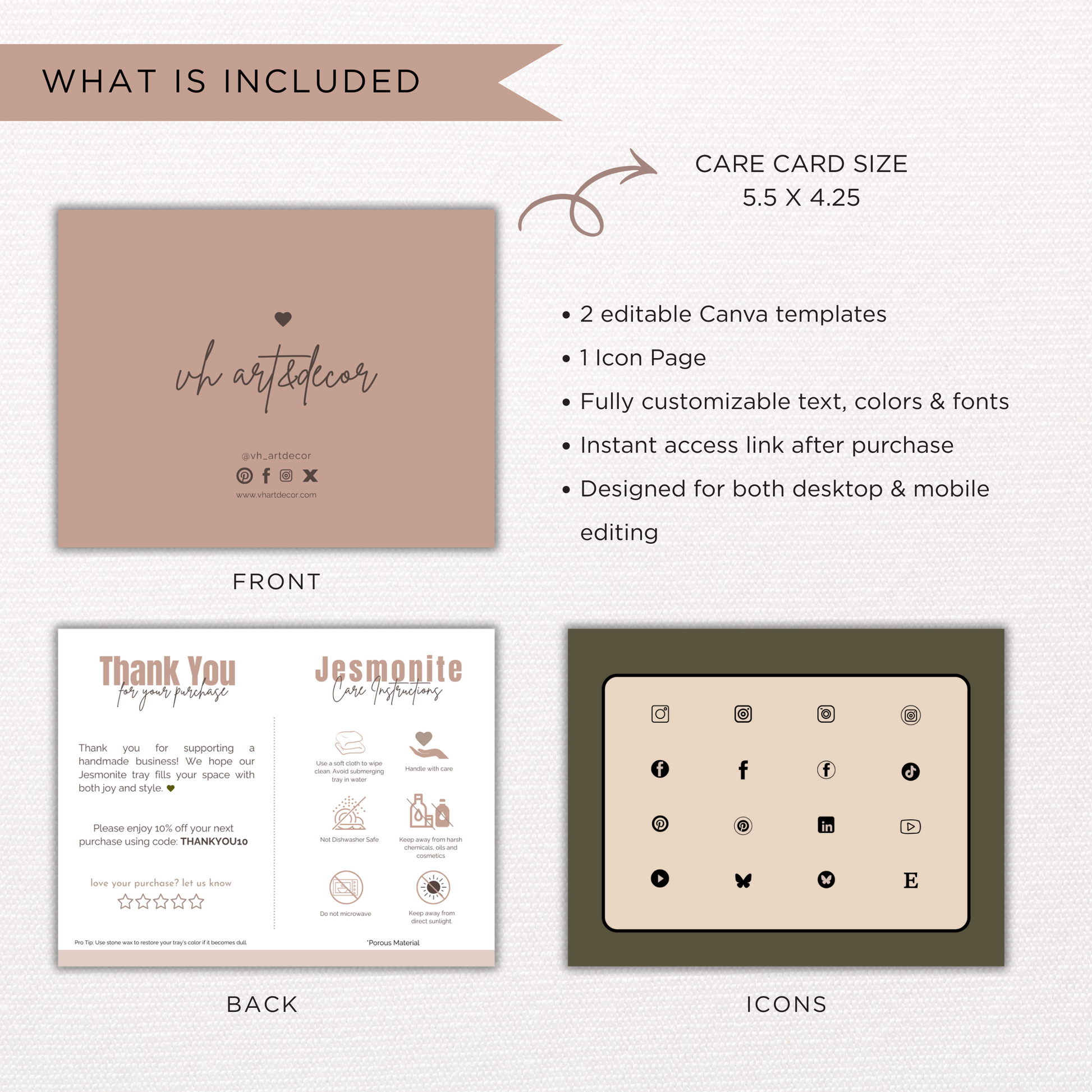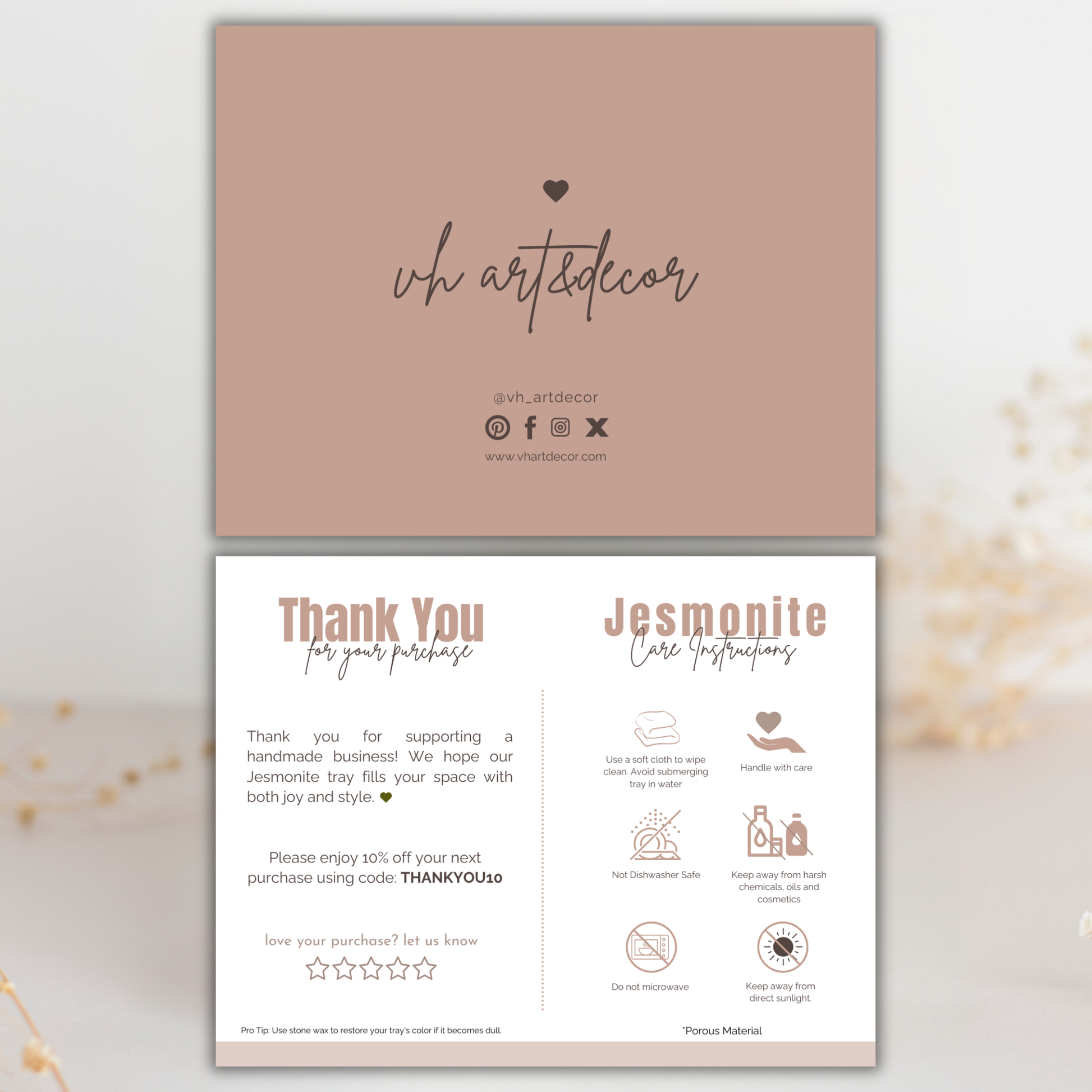 Add a polished, professional touch to your handmade Jesmonite products with this editable care card template. Designed for packaging and order inserts, this Canva template clearly communicates care instructions while seamlessly aligning with your brand aesthetic.