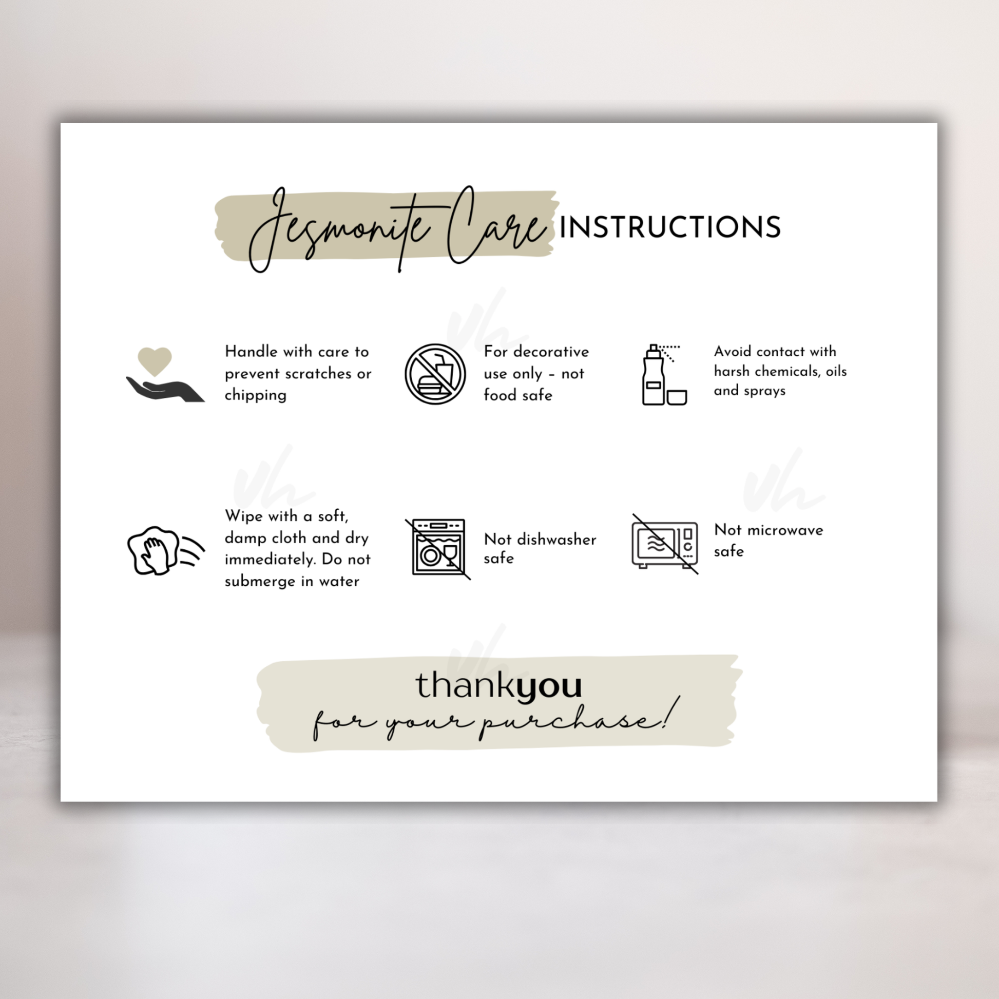 Enhance your packaging with these sleek Jesmonite Care Cards, designed to provide clear care instructions for your handmade products. These high-quality PNG files are ready to use instantly, giving your brand a professional and polished touch.