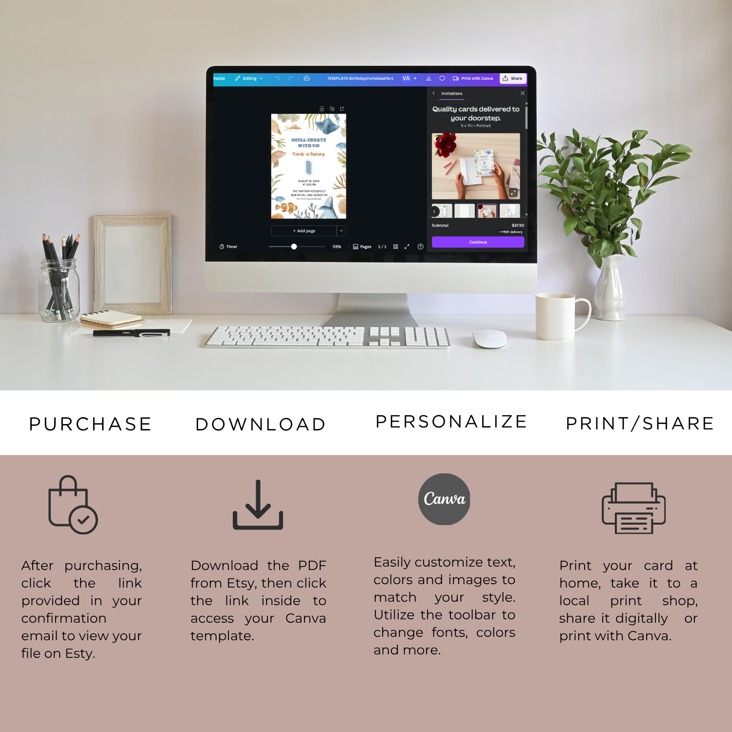 - Save and print at home, at a local print shop, or through Canva for direct shipping.